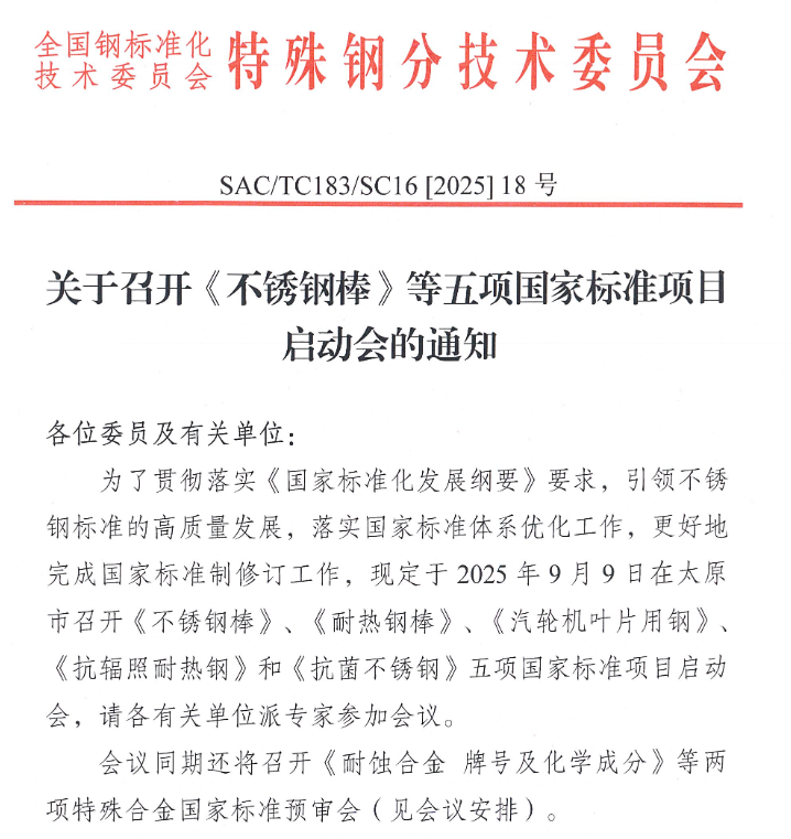 2025年9月9日,《不銹鋼棒》、《耐熱鋼棒》、《汽輪機(jī)葉片用鋼》、《抗輻照耐熱鋼》和《抗菌不銹鋼》五項(xiàng)國(guó)家標(biāo)準(zhǔn)項(xiàng)目啟動(dòng)會(huì)將于太原市召開(kāi)。