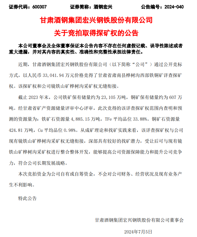 7月5日,據(jù)酒鋼宏興公告稱,公司近期通過公開競(jìng)標(biāo)方式,以人民幣 33,041.94 萬元價(jià)格競(jìng)得了甘肅省肅南縣樺樹溝西部鐵銅礦詳查探礦權(quán)。